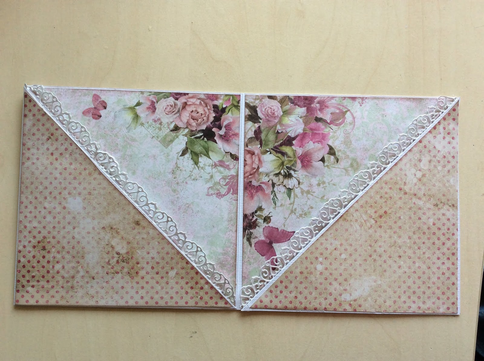 Aan de binnenkant van het 1ste deel heb ik een scrappapier uit paperpad PPJMA04 dieagonaal doorgesneden en dit zoals op de foto opgekleefd.